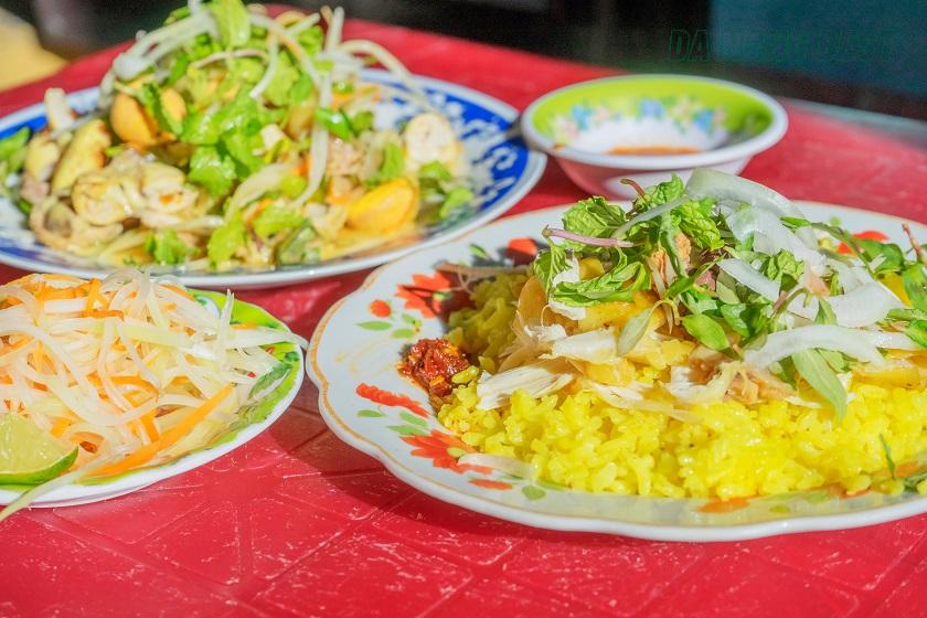 - Cơm gà: Cơm được nấu với nước luộc gà, ăn kèm thịt gà xé và rau sống